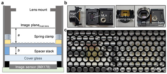 Figure 3a shows the design scheme of the optical alignment module for the wide FOV-LFC. The main lens mount was the c-mount, usually used in vision systems, and the image plane position was configured in consideration of the flange back (17.5 mm). A commercial image sensor (IMX 178, Sony, Tokyo, Japan) was used, which has a resolution of 3096 × 2080. The distance b between the image sensor and the MLA was adjusted by the number of spacers stacked to a thickness of 20 μm per unit to realize the desired M. The MLA was firmly fixed while maintaining a constant distance between the image plane and the cover glass using a spring clamp. Figure 3b shows photographs of the optical alignment module. The lens mount and spring clamp were configured to be detachable using clips, and an alignment post was placed to prevent distortion of the optical orientation. Spring clamps were constructed on the four corners to hold the MLA flat at the same level. Figure 3c shows raw micro-images acquired using a wide FOV-LFC module implemented with M of 2 (left) and 4 (right), respectively, at a FOV of 60°. The matrix of the microlens array used is hexagonal, so the captured raw micro-image is also arranged in a hexagonal matrix. In M = 2, although the overlapping area and baseline are small, each micro-image is seen enough to clearly distinguish the object. On the other hand, in M = 4, the overlapping area and the baseline are large, but the clarity of each micro-image is so low that it is difficult to distinguish the object.