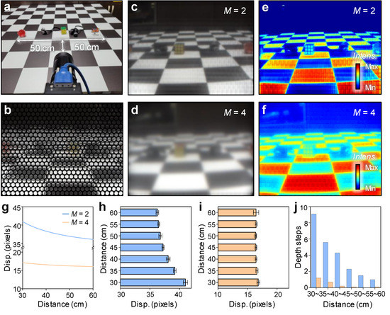 Consequently, the depth can be estimated from a disparity that is simultaneously focused on a correspondence point of at least two micro-images. Figure 5a shows the object placement for LF image rendering and depth map extraction on a checkerboard floor with dimensions of 10 cm × 10 cm per unit. Figure 5b shows raw data of micro-lens images with M = 2 at a FOV of 60°. In the case of M = 2, the patch size is large, and most micro-images are used for rendering (Figure 5c), whereas at M = 4, the image patch size is so small that the number of pixels used to render the image is significantly reduced compared to the number of micro-images (Figure 5d). To evaluate the disparity, we used the open-source Plenoptic Toolbox 2.0 modified to fit our LFC and MLA, and the corresponding matching method used the sum of absolute differences (SAD) algorithm [33]. Although this study focused on the hardware aspect and did not consider distortion, a lot of research was conducted on radial distortion correction for MLA as well as the main lens in light-field cameras, so it was possible to improve the performance of depth extraction [34,35]. In depth maps, in M = 2, depth information with accuracy high enough to distinguish objects, including the checkerboard pattern on the floor from near to far was extracted (Figure 5e). On the other hand, in M = 4, the checkerboard pattern of the floor was only visible in close range, and the objects and the nearby floor were blurred, making it difficult to distinguish depth information (Figure 5f). For depth resolution analysis, the checkerboard was located 30 cm away from the wide-FOV LFC, and the disparity was measured while moving 5 cm to 60 cm in the optical axis direction. Figure 5g is the calculation result of disparity according to distance. Typically, disparity tends to decrease as the distance increases, and the amount of change in disparity also tends to decrease as the measurement distance increases. This implies that the closer the measurement distance, the higher the depth resolution, and the greater the measurement distance, the lower the depth resolution. Even in the disparity plot according to distance, since the parallax trend from near to far is maintained at M = 2, depth information can be extracted with high accuracy (Figure 5g,h). However, in M = 4, the linear correlation of disparity with the distance is acceptable only in the close range, and as the distance increases, the disparity becomes saturated, making it difficult to obtain accurate depth information (Figure 5i). The subpixel unit used in disparity estimation was set to 0.2 pixels, and when the object was 30 cm to 35 cm, the depth step started at nine and gradually decreased at M = 2 (Figure 5j). On the other hand, when M was 4, the depth step decreased from 1.5 to 1 in the 30 cm to 35 cm section, making it difficult to estimate the depth.