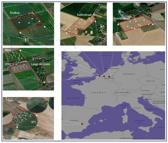Location of seven experiment fields with sampling points in Belgium and Spain (described in Table 1).