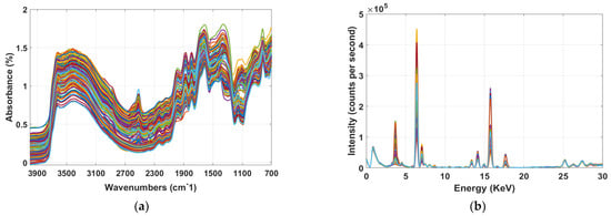 Figure 3a,b displays the raw spectra of soil samples for MIR and XRF. By looking at the MIR spectral profile (Figure 3a), it is apparent that the spectra consist of several absorption bands related to the studied soil fertility attributes. These absorption bands in MIR region are much stronger than the those in visible near-infrared (Vis-NIR) region for soil constituents, where overtones and combinations of the fundamental molecular vibrations in the MIR can be observed. For instance, in MIR functional region the spectral signatures between 3800–3000 cm−1 are related to the stretching vibration of H-O bonds. The bands at 3000–2820, 1730 and 1873 cm−1 are related to the C-H and C=O bonds, whereas the region between 1632–1530 cm−1 corresponds to the stretching and banding vibration of both O-H and C-H groups. In addition, the MIR fingerprint regions around 1409 and 1157 cm−1 are associated to the C-H and C-O bending vibration [34]. It is worth mentioning that the aforementioned vibrations of soil are aroused due to the primary properties (e.g., mainly OC, and MC), which have a direct MIR spectral response whereas, the secondary properties (e.g., pH, P, K, Mg, Ca) have an indirect correlation with the primary properties [3,26]. Based on this hypothesis, the MIR bands corresponding with primary properties can also be used to detect the secondary properties of the soil properties through covariation.