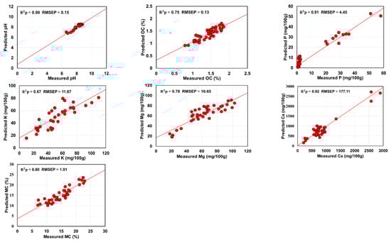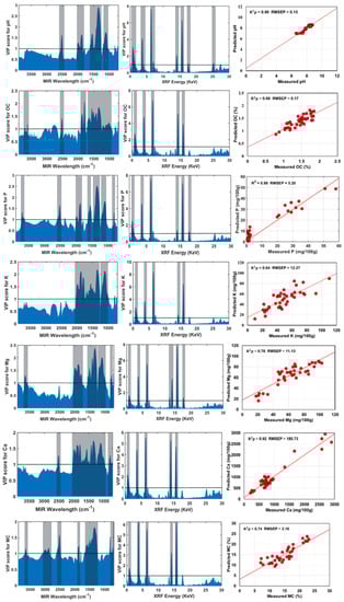 Variable impotence in projection (VIP) score plots for pH, organic carbon (OC), phosphorus (P), potassium (K), magnesium (Mg), calcium (Ca) and moisture content (MC) with corresponding scatter plots of measured against predicted values using the SF-VIP-SOPLS model developed based on selected variables. Units of root mean square error of prediction (RMSEP) are the same as units of respective soil properties. In VIP score plots the solid horizontal lines indicate the threshold values (value = 1) used for variable selection, and the vertical highlighted region is the significant range selected for prediction.