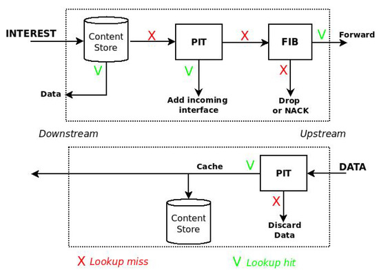 In NDN, caching operations are embedded in the forwarding process of the Interest and Data packets, which is shown is Figure 1.