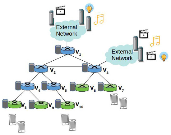 It can be observed that the average request rate for , the most requested content at the edge, is 22 at and 20 at , whereas it is 6 at . When computing the PaC metric for the nodes traversed by the Interests for , according to Equation (5), it results in , , , , , and . The node with the highest PaC metric for is , which is indeed the node closer to the majority of consumers that are attached to the ingress nodes . If instead we consider the path , the node with the highest PaC is . However, caching at would imply that the node at the upper layer, , will not receive further Interests for and therefore, its local request rate will decrease. As a consequence, in a subsequent time window, will be cached at .