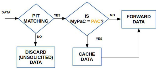When the Data packet arrives, the node checks for a name matching in the PIT and, in case of a positive outcome, the packet is cached and then forwarded towards the consumer(s). Vice versa, if the PIT matching fails, the Data is considered unsolicited and it is discarded.