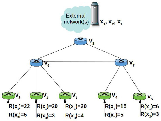 To better understand the PaC metric, we consider the toy example in Figure 6 that includes eight edge nodes in a hierarchical topology. The nodes , , …, are ingress nodes tracking the average content request rate. For the sake of simplicity, we assume that three distinct popular contents, namely , should be cached at the edge and their request rate is stable. The available storage space at each node allows for caching only one content.