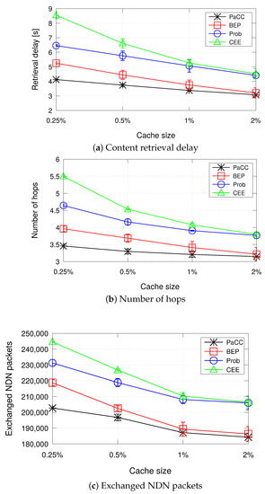 To better show the pros and cons of the conceived solution, we summarize in Table 4 the main differences between the compared schemes in terms of incurred overhead, i.e., additional signalling bytes piggybacked in the exchanged NDN packets. A high signalling overhead introduced by a caching strategy could deteriorate the content retrieval performance, e.g., by increasing the content retrieval delay due to the transmission of larger packets that occupy the channel for a longer time and may generate a higher channel load and resulting congestion. It is worth observing that the blind CEE and Prob schemes incur no additional overhead. Similarly to PaCC, BEP foresees one additional field in the Data packet to convey the maximum betweenness to be compared with that of the nodes along the backforwarding path. It is the PaC metric in our proposal. Three additional fields per Interest are foreseen by PaCC, for a total of 10 bytes (less than 1% overhead per packet). For BEP, the overhead per Interest is a function of the number of nodes traversed along the path () by the packet carrying the BetweennessArray field. For a path made of 5 nodes the overhead gets equal to 24 bytes. Under the majority of settings (), PaCC is also more efficient than BEP in terms of exchanged bytes in the network per packet. Therefore, the signalling overhead introduced by PaCC is extremely low, which contributes to limit the retrieval delay metric, as showed in Figure 7 and Figure 9.