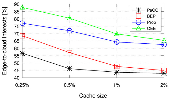 To conclude the analysis, Figure 8 shows the percentage of Interest packets that reach the origin server because it has not been found a CS matching at the edge. Reasonably, the traffic to the cloud reduces when the storage space at the edge increases, with PaCC outperforming all the benchmark schemes.
