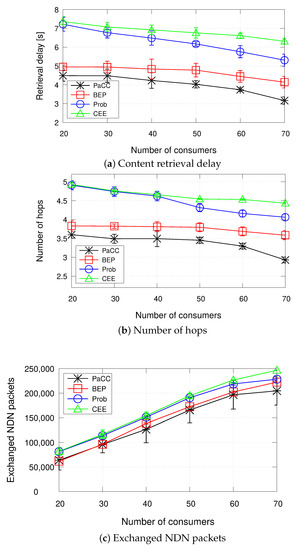 It can be observed that, as the number of consumers increases, all schemes experience a shorter delay and a lower number of hops. Such a behaviour has to be ascribed to the fact that under the simulated settings, due to the Zipf distribution, a higher number of requests, from different consumers, concentrate on the same few contents, the most popular ones. Hence, such contents are more likely to be cached in the edge domain, instead of being retrieved from the original producer. The number of exchanged packets, instead, reasonably increases with the number of consumers, to account for the increasing number of Interests issued by more consumers and number of Data packets forwarded to each single consumer.