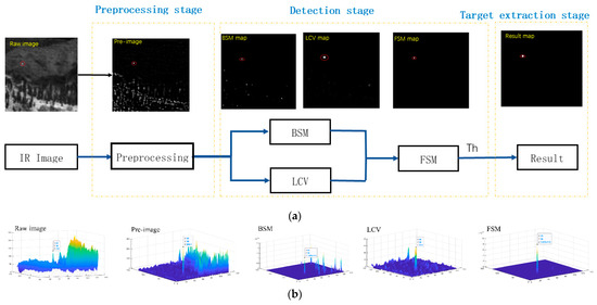 The flowchart of the proposed method is shown in Figure 1. The proposed algorithm consists of three important parts. First, the original IR image is preprocessed to extract potential target regions. Second, background suppression and target enhancement are applied to the preprocessed images to obtain saliency maps of the two modules. Finally, an adaptive threshold segmentation mechanism is applied to extract the detected true target from the final weighted saliency map.