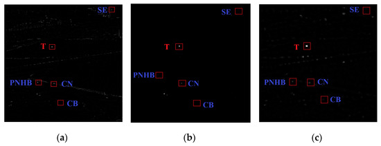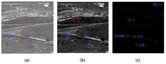 Figure 2a shows a typical sample of a real IR image containing the target (denoted by T), constant background (denoted by CB), clutter noise (denoted by CN), strong edges (denoted by SE), and pixel-sized noise with high brightness (denoted by PNHB). Figure 2b is an image showing the effects of processing the image with the two-dimensional Wiener filter. The edge and high-frequency detail information of the image are better preserved, and the Gaussian noise is suppressed. From Figure 2c, it can be seen that after high-pass filtering, the image is effectively cleared of the low-frequency part of the background and the CB is very cleanly suppressed. However, the CN, SE, and PNHB cannot be filtered effectively. To improve the detection efficiency, this work focuses on two aspects: suppressing complex backgrounds (e.g., CN, SE, PNHB, and other noise) to reduce false alarms, and enhancing targets to improve target detection performance.
