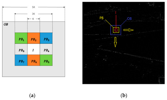 In order to detect small targets ranging from 2 × 1 to 9 × 9 pixels (a target larger than 80 pixels is no longer considered a small target, which is beyond the scope of this study), a new three-layer window is designed, as shown in Figure 3a. The entire window is divided into three regions, where the innermost region I expresses the reference cell (representing the region where the target might appear). The middle region is protected region , which is around I with eight sub-windows. The outermost region OB expresses the background region. When the target is located in the center of the three-layer window, the differences in orientation and grayscale of the target are reflected in all three regions, regardless of the size of the target, and these differences can be used to detect targets of different sizes.
