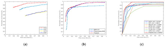 The receiver operating characteristic (ROC) reflects the algorithm’s detection performance. ROC describes the relationship between detection probability and the false alarm rate , which is defined as follows [22,23,24]: