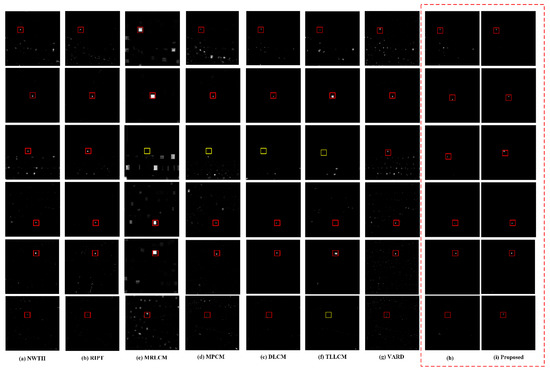 Figure 8a–f shows the results of comparison algorithms for detecting small IR targets with different complex backgrounds. Figure 8h represents the result of direct detection of the original image without the preprocessing stage. Figure 8i shows the results of the proposed algorithm. The true targets are marked with rectangles. The red rectangle indicates that the target can be detected, and the yellow rectangle indicates that the target cannot be detected.