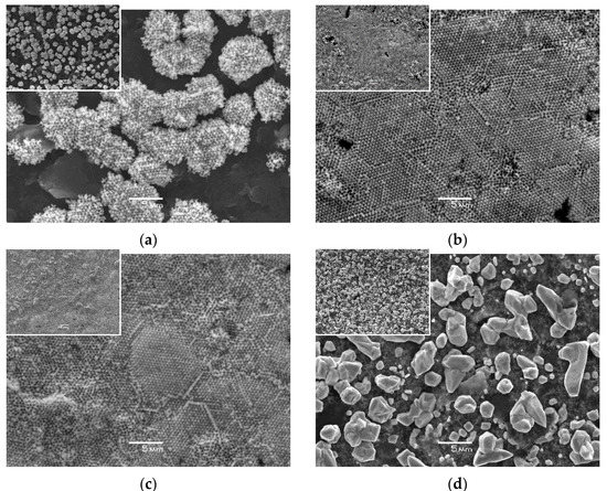 SEM images of pCuFEs prepared using colloidal crystal templating with 500 nm polystyrene spheres, constant current of –1.5 mA, and various times of copper electrodeposition from 0.1 mol L−1 Cu(II) in 0.01 mol L−1 HNO3 (pH 2): (a) 30 s; (b) 60 s; (c) 90 s; (d) non-porous Cu film formed without colloidal crystal template after 90 s electrodeposition for comparison (magnification 3000×, scale bar 5 µm). Insets are a lower magnification (1000×, scale bar 10 µm) of corresponding electrode surfaces.