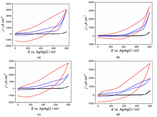 Cyclic voltammograms of 1 mmol L−1 saccharides in 0.1 mol L−1 NaOH using bare SPCE (black line), CuFE (blue line) and pCuFE (red line) and scan rate 50 mV s−1: (a) glucose; (b) sucrose; (c) fructose; (d) galactose. Each experiment was performed on a newly prepared sensor.