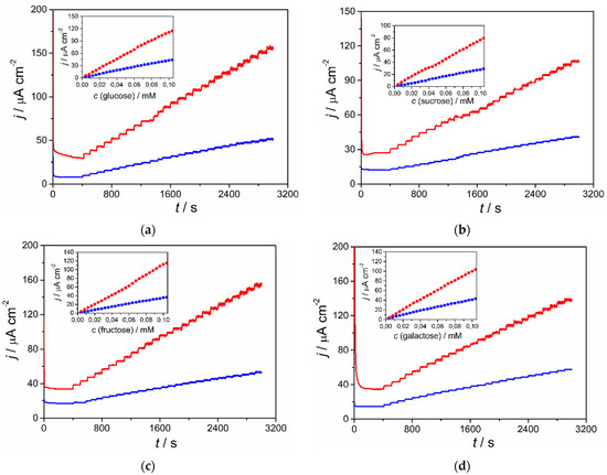 Hydrodynamic amperometry of saccharides within concentration range 4 × 10−6–1 × 10−4 mol L−1 saccharides in 0.1 mol L−1 NaOH at +0.6 V vs. Ag/AgCl using CuFE (blue line) and pCuFE (red line): (a) glucose; (b) sucrose; (c) fructose; (d) galactose. Each experiment was performed on a newly prepared sensor.