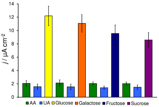 As can be expected, most sugars will provide a current response, and therefore for samples containing a mixture of different saccharides, the obtained current response will correspond to their total amount. Herein, it is important to realize that already developed non-enzymatic sensors have faced the same problem. It is evident that the applicability of pCuFEs only depends on the appropriate selection of samples. For example, in clinical analysis, the literature reports up to 100-fold higher glucose concentration than galactose in plasma [36,37]. The content of other sugars, especially mannose and fructose, in human blood plasma and serum is an almost trace amount (tens-of-micromolar concentrations) [38,39]. The limit of UA in blood plasma for a healthy person is around 0.4 mmol L−1, whereas for glucose it is around 5 mmol L−1 [40,41].