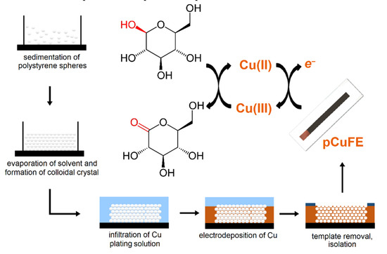 In this paper, a colloidal crystal templating technique [27] has been used for the preparation of porous copper layers onto surfaces of screen-printed carbon electrodes (SPCEs) which were fabricated by the screen printing of commercially available carbon ink on alumina ceramic supports. Detailed morphological characterization of obtained porous structures was performed using scanning electron microscopy. Electroanalytical properties of the porous copper film electrodes (pCuFEs) were investigated using cyclic voltammetry and amperometry of selected saccharides, namely glucose, sucrose, fructose, and galactose.