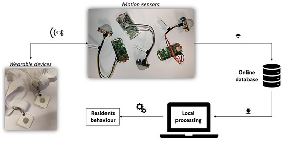 - When a PIR motion sensor is triggered by a resident’s movement, the Raspberry Pi Zero W connected to it scans the surrounding area searching for devices that emit BLE signals: the system is set to detect only the BLE signal of tags worn by residents.