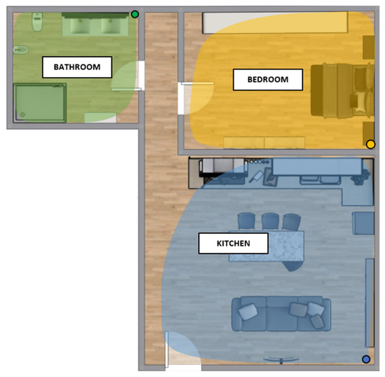 The sensor network has been installed inside a home where two older people live: a 72-year-old man and a 64-year-old woman. A PIR sensor and a Raspberry Pi Zero W device were installed in the kitchen, bathroom, and bedroom. Figure 4 shows the floor plan of the house where the positions of the PIR sensors inside the rooms (green for the bathroom, yellow for the bedroom, blue for the kitchen) are represented by the colored points, while their detection ranges are represented by the colored areas. The PIR sensors were installed at a height of 1.5 m from the ground to better detect the movements of the residents. The walls that divide the internal rooms of the house have a thickness of 15 cm and are made of perforated brick blocks with lime plaster on both sides.