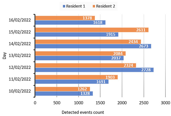 The data collected by the system during the test carried out in the real multi-resident scenario with the two older residents living at home were processed following the metrics proposed in Section 4.1 and Section 4.2. The data collected consist of the events detected by the system in the three rooms where the PIR motion sensors have been installed (bathroom, kitchen, bedroom), the identity of the resident associated with them, and the time of detection. The data were collected for a week, starting from 00:00 on 10 February 2022 until 00:00 on 17 February 2022. Figure 5 shows the number of detected events per day for each resident.