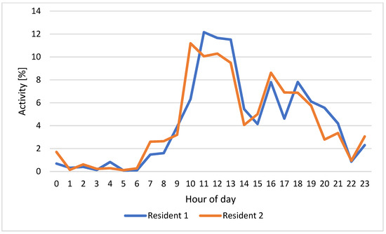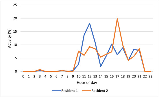 Figure 6 shows an example of residents 1 (in blue) and 2 (in orange) HAPs for one day (12 February 2022), while Figure 7 reports the weekly HAPs average of residents 1 (in blue) and 2 (in orange). The HAPs for the entire week of both residents have been calculated.