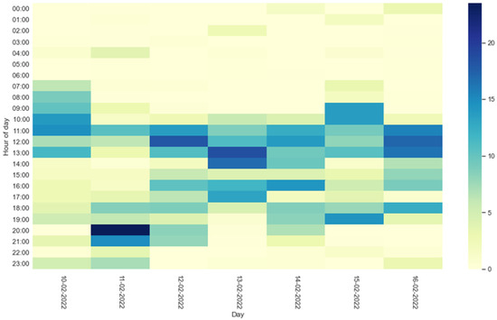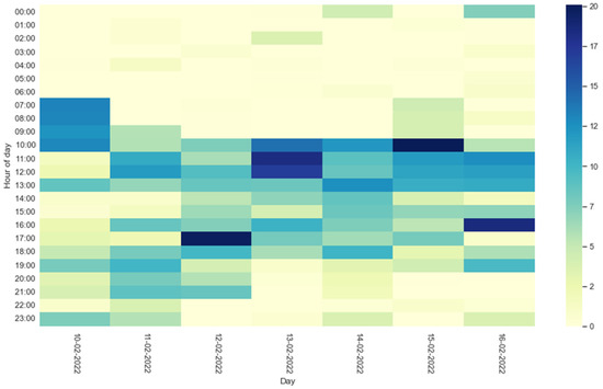 Information on residents’ activities during the day can also be evaluated through the heatmaps shown in Figure 8 and Figure 9. The percentage of activity carried out by the residents during the days of the test week is represented by a color: a light color reflects a low percentage of activity, while a dark one reflects high activity. The heatmap thus offers a quick and easy way to understand the times of the day when older people have been most active.