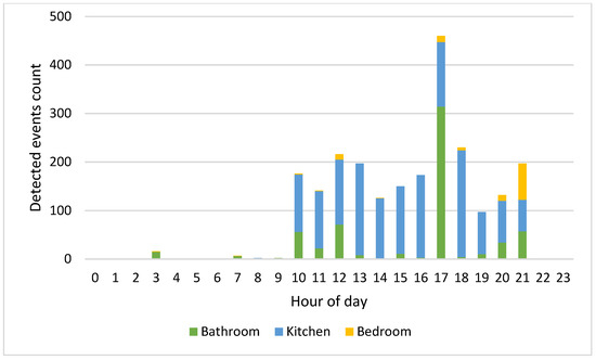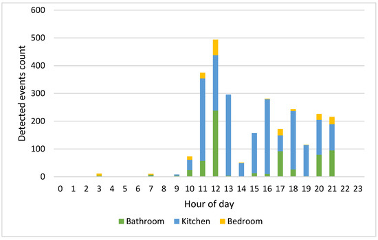 Since the residents carry out their activities at different times of the day, the HAPs for the whole week have been calculated. Considering Figure 6 relating to the HAPs of residents 1 and 2 on 12 February 2022, the time bands of greatest activity are those between 10:00 and 13:00 and between 15:00 and 21:00. Figure 10 and Figure 11, which show the number of events detected on the same day for residents 1 and 2 in the three monitored rooms for each hour, help to better understand which kind of activity the residents were carrying out. Resident 1 is assumed to be cooking/eating and carrying out personal hygiene activities between 11.00 and 13.00 due to high activity in the kitchen and bathroom. We observe in Figure 6 a peak of activity around 12.00, which Figure 10 shows was mainly carried out in the bathroom. In the afternoon, most of the activities were detected in the kitchen, so we can assume that the resident was watching TV/relaxing on the sofa and/or eating, while around dinner time the actions can be associated with cooking/eating and personal hygiene due to events detected in the kitchen and bathroom. On the other hand, we assume that resident 2 carried out cooking/eating and watching TV/relaxing activities between 10.00 and 21.00 due to the continuous presence detected in the kitchen. We observe in Figure 6 a peak of activity around 17.00 that Figure 11 helps to relate with personal hygiene activities (probably, resident 2 took a shower).