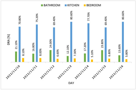 Figure 12 and Figure 13 show residents 1 and 2 DRA for the test week, while Figure 14 shows the weekly DRA average for both residents. Most of the activity carried out by residents was in the kitchen, given the high value of average DRA in it (74.80% for resident 1 and 75.60% for resident 2). The average DRA of the bathroom is 18.40% for resident 1 and 18.90% for resident 2, while we notice a low DRA value for the bedroom (6.80% for resident 1 and 5.50% for resident 2), which can be explained by the fact that the PIR sensor is only activated when the residents enter/leave the room or dress in it. Most of the time spent in the bedroom is in fact associated with the action of sleeping, so we expected low values of activity detected in it, resulting in low DRA values.