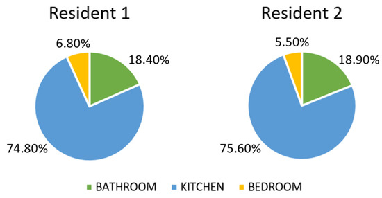 Furthermore, the collected movements of older people inside the home can be used to retrieve the activities carried out in each room. The multi-resident activity detection sensor network is designed initially to be installed in three rooms of the house: bathroom, bedroom, and kitchen. The number of events captured per location may reflect how many of older people’s activities are assigned to perform a specific ADL such as personal hygiene, eating, etc. The Daily Room Activity (DRA) of each resident is computed by dividing the number of events detected in a room by the total number of events for each day (Equation (4)).