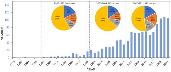 The number of documents published in the printed gas sensor field in 1979–2021 from sources indexed by Scopus (search on 12/04/2022) under the key words of “gas sensor” and “printing”. Insets: the top three countries in the field at approximately decade time periods and their relative portion of publications.