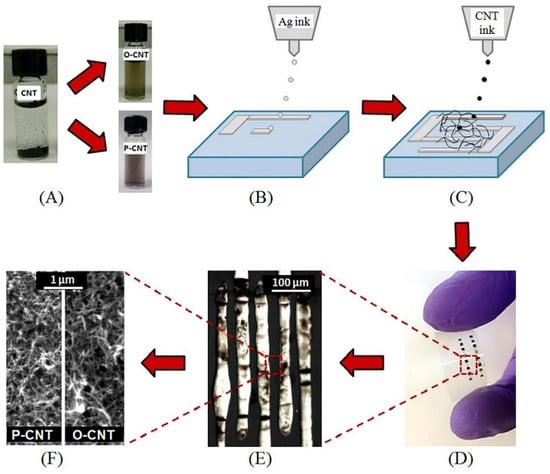 Fully printed and flexible CNT-based gas sensor: (A) CNTs functionalization with carboxylic acid (O-CNTs) and PEDOT:PSS (P-CNTs); (B) printing of Ag electrodes; (C) printing of CNT; (D) photograph of the sensor on flexible substrate; (E) optical microscope image showing the printed silver interdigitated electrodes, and (F) SEM image showing the printed CNTs. Reproduced from ref. [55]. Copyright 2016, Elsevier, Ltd.