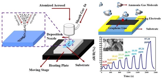 Schematic diagrams of aerosol jet printing to fabricate ammonia gas sensor; dynamic and quantitative responses of the sensor to NH3 at various concentrations. Reproduced from ref. [58]. Copyright 2021, Elsevier, Ltd.