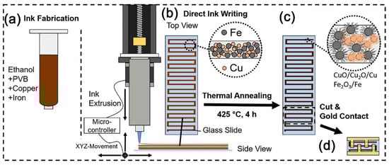 Schematic sensor fabrication process by 3D printing: (a) ink fabricated by mixing Cu and Fe microparticles in ethanol, stirring in PVB until a homogeneous state, then the ink is filled into the printer cartridge; (b) direct ink writing via piston-driven syringe pumps in a 3D-printing setup; layer by layer building of meandering Cu-Fe stripes; (c) The glass slide with the printed object is placed in an oven at air at 425 °C for 4 h where the metal oxide nanostructures are formed; (d) Single sensor devices are coated with Au and then cut for further electrical and sensor investigations. Reproduced from ref. [74]. Copyright 2020, Elsevier, Ltd.