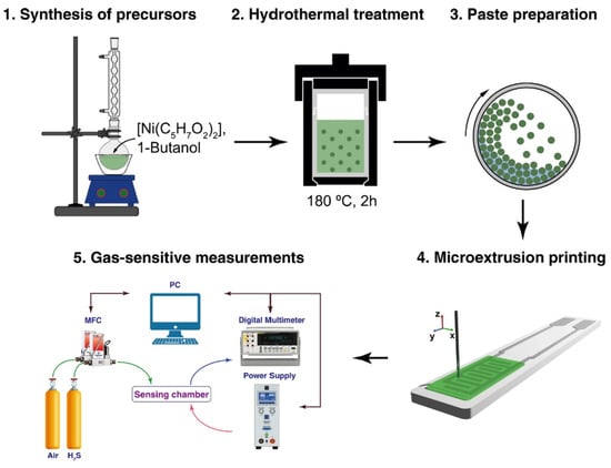 Scheme of hydrothermal synthesis of anisotropic NiO nanostructures and preparation of the ink on their basis that are used for the microextrusion printing of oxide receptor layers. Reproduced from ref. [88]. Copyright 2021, Elsevier, Ltd.