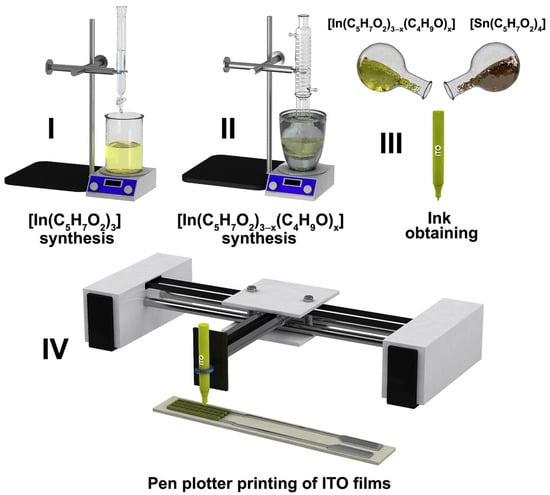 Scheme of the ink obtaining and pen plotter printing of ITO films. Reproduced from ref. [102]. Copyright 2021, Elsevier, Ltd.