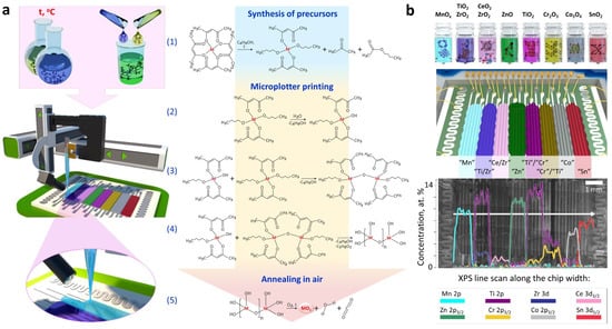 On-chip multioxide combinatorial library printed by microplotter: (a) Schematic illustration of the fabrication process including the cartoon of the experimental printing setup with a microplotter and chemical routes for heteroligand precursor synthesis (1), their hydrolysis (2), condensation (3), polycondensation (4), and oxide crystallization (5); (b) Chip prototype fabricated with oxides of the list drawn at the first line: the animation drawing and SEM image; the concentration of the different metal elements along the chip surface detected by XPS scanning in the direction indicated by a white arrow; the signals related to O 1s stemming from the substrate/printed layers and Si 2p from the substrate are not depicted here. Reproduced from ref. [107]. Copyright 2020, American Chemical Society.