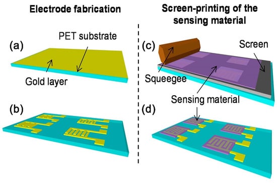 The fabrication of humidity sensors by screen printing: (a) deposition of the Au layer on PET (Poly-Ethylene Terephthalate) substrate; (b) laser ablation of the Au layer; (c) screen printing of the TiO2 nanoparticles; (d) sensors after screen printing. Reproduced from ref. [124]. Copyright 2017, MDPI.