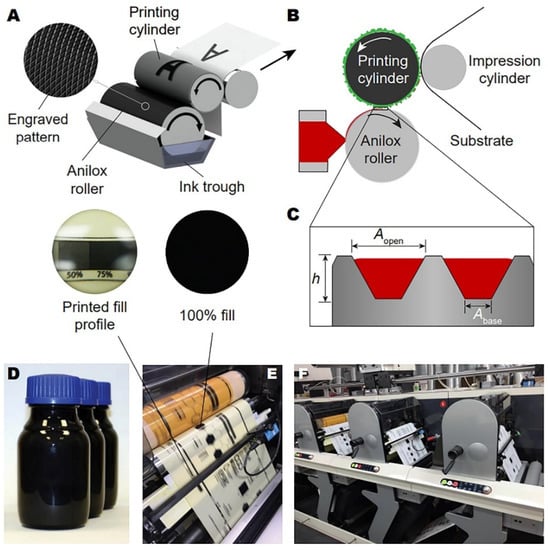 In flexographic printing, inks from a container are transferred to an anilox roller to fill the engraved cells as basically shown in Figure 10 [21]. Then, the inks go from the roller to photopolymeric flexographic master mold placed at a plate cylinder. At this stage, the inks are subjected to both shear and tensile stresses. Further, the inks are carried from the mold to the substrate on the printing cylinder for drying to complete the printing process. Flexible printing molds with relief patterns, normally made of resin or photopolymers, along with liquid fast-drying inks of low viscosity, are usually employed in this method [147].