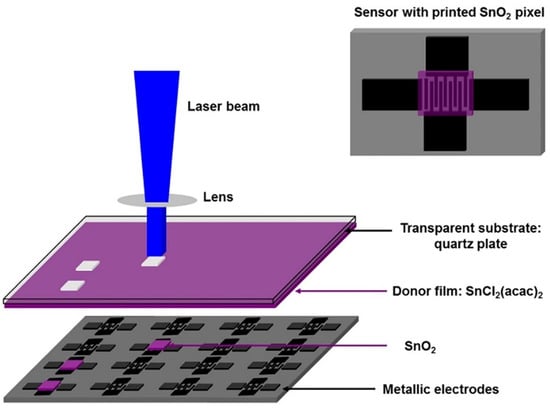 At the same time, this technique is rather complicated to be dependent on the prefabrication of donor materials, whose characteristics largely ensure the efficiency of the deposition process and the output properties of the target materials. According to literature, LIFT can be used not only in the field of gas sensors [162], but also is expected to help in designing RFID tags, various biosensors, alternative energy devices, e.g., solar cells [166], and wearable electronics [167,168,169,170,171,172]. The prospects of this technology were recently discussed in detail by Delaporte and Alloncle [173].