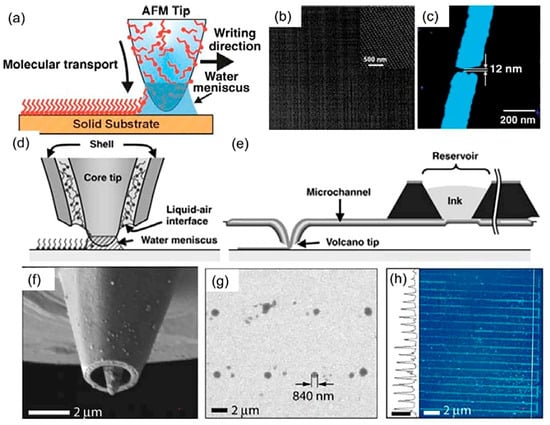 (a) Schematic representation of the dip pen nanolithography (DPN) process. A water meniscus forms in area between tip and substrate which facilitates a molecular transport from the tip to the target substrate; (b) Tapping mode AFM images of 60 nm Au nanodots deposited by DPN and subsequent etching; (c) 12 nm Au nanogap fabricated by DPN and subsequent etching; (d) Schematic representation of fountain pen nanolithography. The ink is dispensed through the hollow tip to the substrate; (e) Schematic representation of the nanofountain pen probe structure. A micro reservoir for storing inks is connected to the volcano tip through a microfluidic channel; (f) SEM image of the volcano tip; (g) SEM image of a 2 × 4 array of anti-BSA IgG dots patterned on a BSA substrate (46% RH) by fountain pen; (h) Tapping-mode AFM image and height profile of parallel lines of biotin-BSA patterned on 6-Mercaptohexanoic acid (MHA) at a translation rate of 80 μm/s (50% RH, height scale bar in profile is 20 nm). Reproduced from Ref. [174]. Copyright 2017, MDPI.