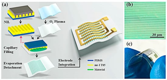 (a) Schematic illustration of the preparation process of flexible NW-based sensors under NIL protocol; (b) Optical microscope image of the highly aligned PEDOT:PSS NWs; (c) Picture of the integrated flexible device. Reproduced from Ref. [188]. Copyright 2019, American Chemical Society.