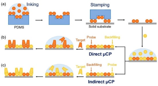 Schematic illustration of the fabrication and biorecognition processes, including (a) inking and stamping, (b) standard microcontact printing (μCP), and (c) indirect μCP. Note that in standard μCP, probes are patterned by stamping, whereas in indirect μCP, backfilling agents are stamped first and then the probes are physisorbed on the gaps just by incubation. Reproduced from ref. [200]. Copyright 2018, MDPI.