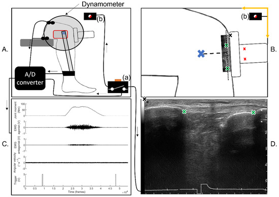 (A) Representation of the lab setup for the knee measurements. The red box represents the camera used to record videos, the lens was aligned with the joint centre represented by the blue cross. The trigger box (a) illuminated a LED (b) to sync the video and was captured by an analog to digital (A/D) converter as a 5 V signal and in the ECG input of the ultrasound video (shown on (D)). (B) Visual representation of the camera’s field of view, the anterior-posterior axis, vertical axis and coordinate system origin are represented by the yellow arrows, the LED light used to sync the videos is represented by (b), the blue cross represents the joint centre, the red crosses represent the markers placed on the ultrasound probe, the black cross represents the transducer origin (also represented on (D)), the green crosses represent the tendon’s proximal and distal insertions (also represented on (D)), the black dotted line represents the tendon’s line of action, the black dashed line represents the tendon’s moment arm. (C) Example of data collected from the dynamometer, EMG and trigger box. (D) Ultrasound image of the patellar tendon with the sync trigger visible at the bottom, black and green crosses represent the origin of the transducer and the tendon’s insertions, respectively.