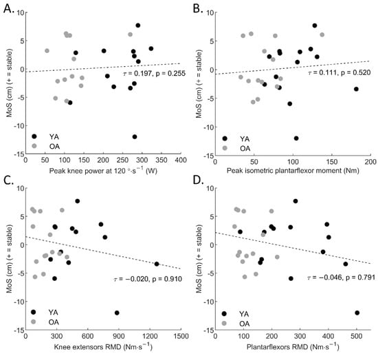 Correlations between (A) peak knee power at 120°·s−1 and margin of stability (p > 0.05), (B) peak plantarflexor moment and margin of stability (p > 0.05), (C) knee extensors rate of moment development and margin of stability (p > 0.05), (D) plantarflexors rate of moment development and margin of stability (p > 0.05). YA: young adults, OA: older adults.