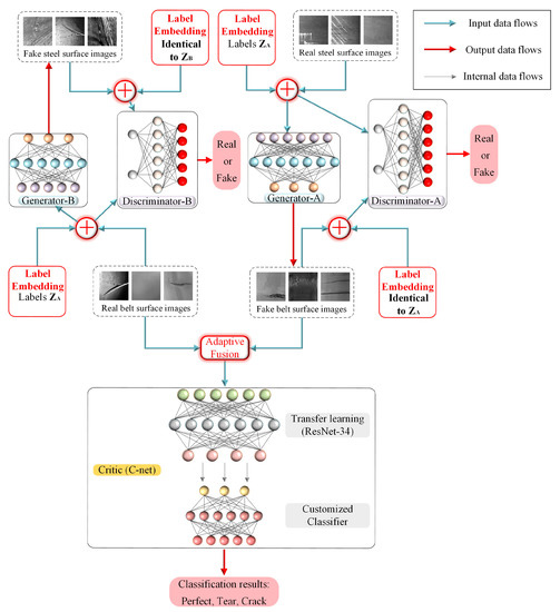 Samples of damaged conveyor belt images are scarce and time-consuming since the acquisition environment in the mine is harsh. Inspired by CycleGAN [32], an improved Multi-Classification Conditional CycleGAN is proposed to generate damaged conveyor belt sample images and classify the belt damage. Since the damage styles between belt and steel plate are similar, we gathered the steel defect dataset from “Severstal: Steel Defect Detection” at Kaggle.com (accessed on 10 April 2022) and assume that some latent connections existed between the steel defect dataset and the conveyor belt dataset, since the damage forms between these datasets are similar except the stylistic difference. In order to address the problem of different damaged images classification, a multi-class classifier is introduced in the proposed MCC-CycleGAN, the topology of MCC-CycleGAN is shown in Figure 1.