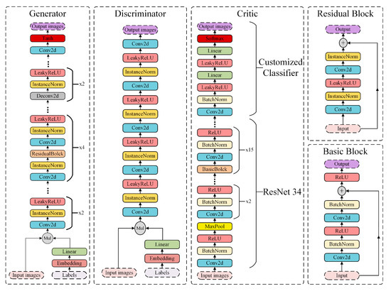 The network architecture of the Generator, Discriminator, and Critic. The residual block is used in the Generator networks, and the basic block appears in ResNet-34.