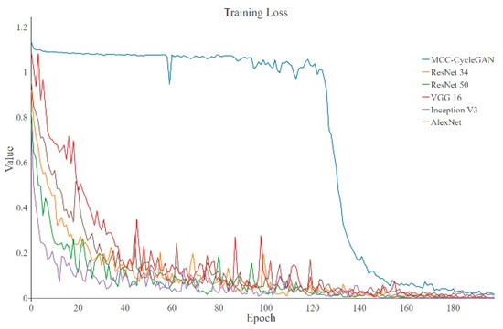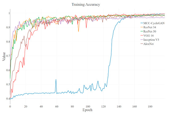 The training loss and accuracy curves of the proposed MCC-CycleGAN and other comparative classical deep learning networks are shown in Figure 6 and Figure 7, respectively. We can see from Figure 6 that except of the proposed MCC-CycleGAN, other algorithms loss curves drop fast and tend to be stable at epoch 110. Combined with Figure 7, accuracies of contrastive algorithms increase rapidly because of insufficient training. The reason why the proposed MCC-CycleGAN converges slowly can be explained as follows. The proposed MCC-CycleGAN contains two sub models for sample generation, which can supplement the insufficient samples in custom dataset. In addition, considering the proposed image fusion strategy, the MCC-CycleGAN model is fed with new generated samples before 100 epochs. After 100 epochs, the MCC-CycleGAN model is trained to a certain extent and the proportion of generated image is decreasing, from 0.9 to 0.65. The training process tends to be stable after 120 epochs and the loss of the proposed MCC-CycleGAN model is drastically reduced. So, the low training loss and high training accuracy occur at 140 epochs, which is slower than other comparative networks.