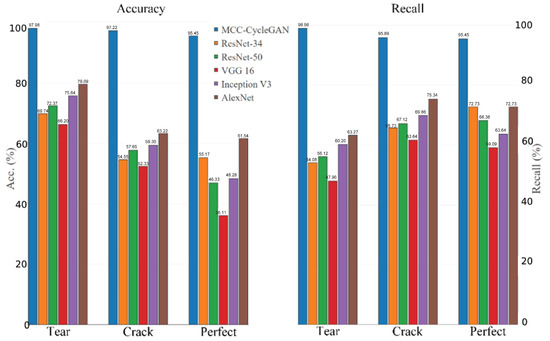 The results of above networks in test dataset are demonstrated in Figure 9 and Table 4. It can be seen that mean average precision (mAP) of the proposed MCC-CycleGAN reaches 96.88% and the proposed network performs excellent in test dataset. However, the best mAP in all contrastive networks does not pass 70%, which cannot satisfy the application requirements.