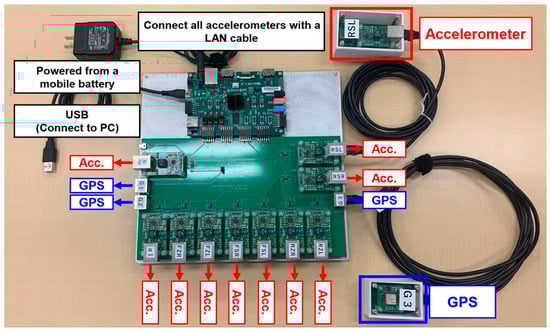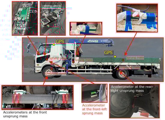 Accelerometers were installed at a total of 10 locations (8 locations (front or rear × left or right × sprung mass or unsprung mass) and two additional locations). A three-axis MEMS (Micro Electro Mechanical Systems) accelerometer (ADXL 355 by Analog Devices Inc., Norwood, MA, USA) was used in the experiment. The sampling frequency is 300 Hz, and the acceleration measurement range is ±8 g. The vehicle position is measured by GPS receivers (AE-GYSFDMAXB by TAIYO TUDEN, Tokyo, Japan) installed at three points (one point directly above the center of the front wheels and two points directly above the left and right rear wheels). The test vehicle (Fighter Mitsubishi FUSO) was loaded with steel plates, weighing 13.6 tons. Figure 1 shows a photograph of the vehicle used in the experiment and the accelerometer’s position. Figure 2 shows the vehicle acceleration sensor system used in this study. The measurement system uses FPGA (Field-Programmable Gate Array), and each accelerometer and GPS receiver are connected using a LAN cable. In addition, power is supplied from the mobile battery, and the data are recorded on the PC. Vehicle vibration and position data are output 300 times per second. The time of vehicle vibration and position is synchronized based on the accurate time (GPS timestamp) included in the satellite signal measured by the GPS receiver. However, the GPS position and time information is updated every second. At the time of the first updated GPS timestamp, the measured CPU time is set to 0. By the above operation, the vibration and position of the vehicle can be accurately synchronized with the GPS time. Since there is a time lag before the measured latitude and longitude are saved, the previously measured latitude and longitude will be output when the GPS timestamp is updated. Therefore, the latitude/longitude data were corrected to match the update timing of the GPS time stamp. Latitude/longitude data with a sampling frequency of 1 Hz were linearly interpolated to be 300 Hz.